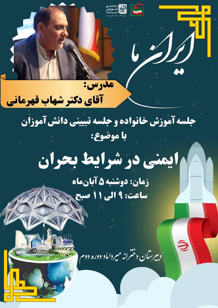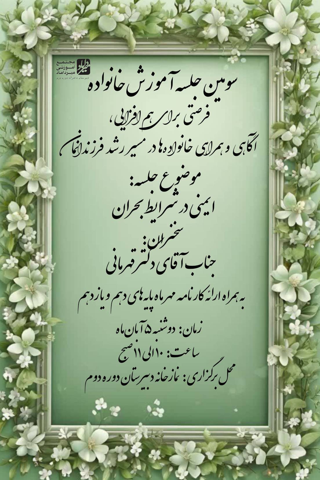 *جلسه آموزشی خانواده *در مسیر رشد، خانواده اولین همراه است 💚موضوع جلسه:“ایمنی در شرایط بحران”سخنران:جناب آقای دکتر قهرمانی📌 به همراه ارائه کارنامه عملکرد مهرماه پایههای دهم و یازدهم🌱 *دبیرستان دخترانه دوره دوم میرداماد*